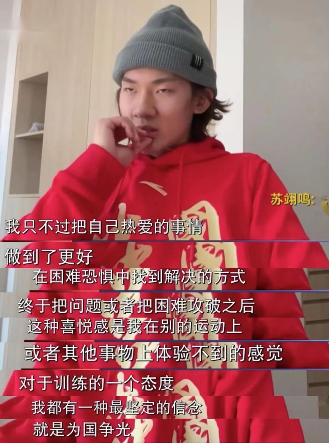 他一点不认为每天7、8个小时不停地转,不停地翻会很累很枯燥,相反他觉得这和小时候玩是一样的,每天都给他带来快乐,每天都在进步,苏翊鸣很享受这个过程。