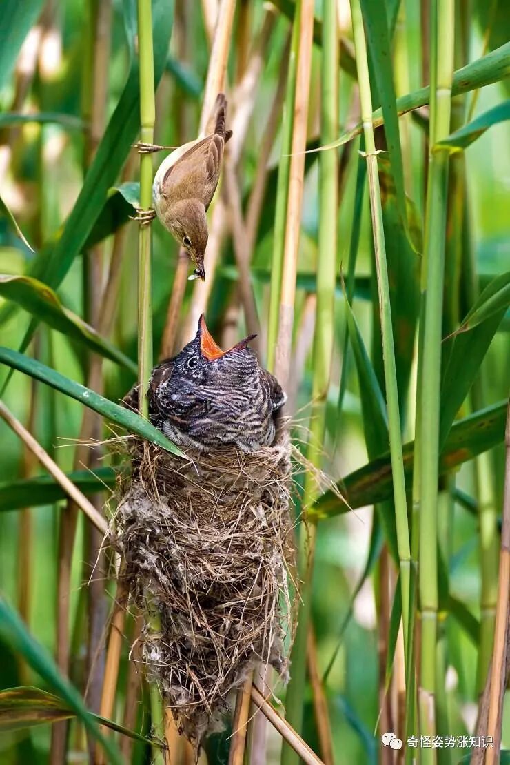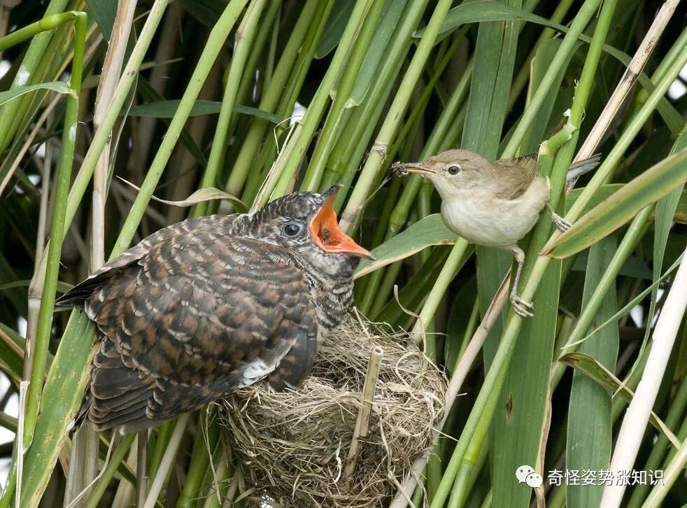 嗯。“寄养”顾名思义,也就是将自己的卵产在别的鸟类的巢中,让别的鸟儿代替它们喂食幼崽,就像是人类社会所指的“奶妈”。