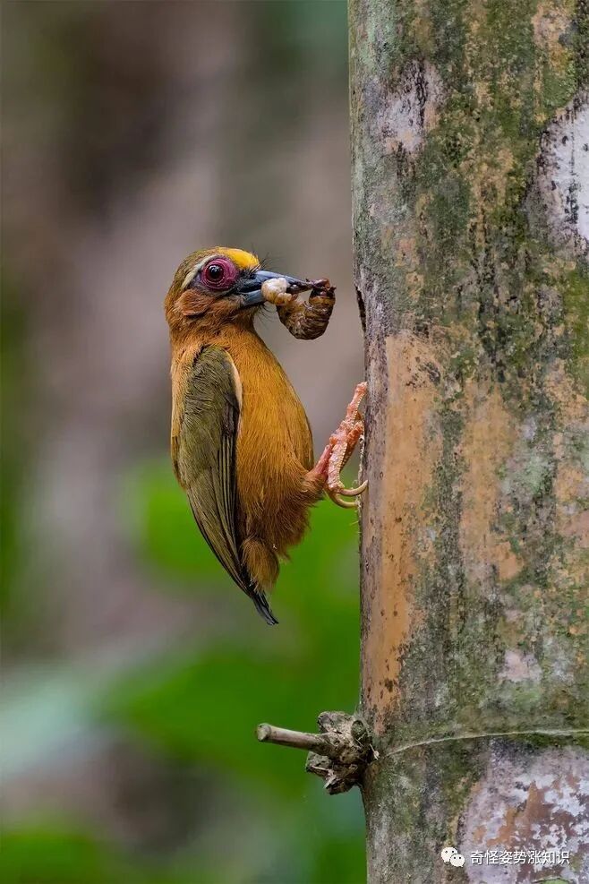 啄木鸟在觅食的时候不像其他鸟类是站在伸出的树枝上,而是直接用爪子攀缘在相对直立的树干上。他们会利用自己稍短的四指牢牢的抓住,相对平滑的树干不会滑下来,而且还能够在树干上上下灵活地跳动甚至旋转。