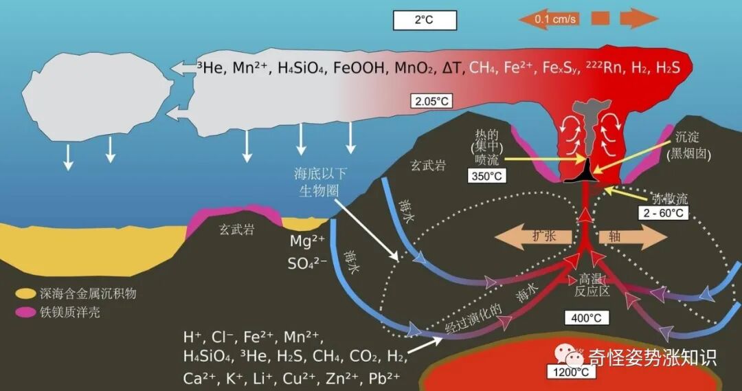 热泉内部包含不同的矿物质,喷发出来的颜色呈现黑色、黄褐色、蓝绿色等。很多海底生物会因此敬而远之,但仍有特殊的种群选择在热泉旁存活。