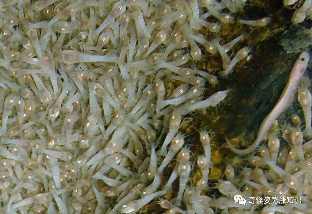 极为罕见的是,数以千万计的“无眼虾”把喷射口的外围笼得密密匝匝,最多大概有2000只就栖居在一个平米的范围之内。