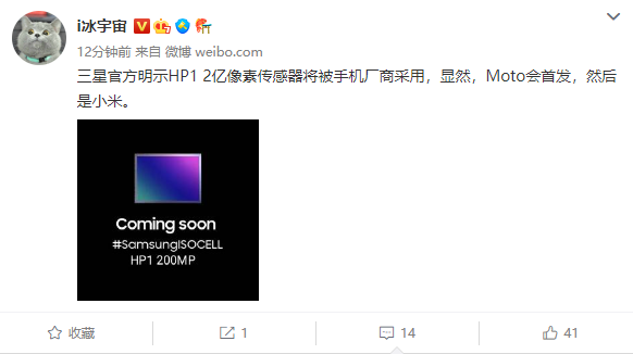 据知名数码博主 @i 冰宇宙最新发布的信息显示,与此前曝光的消息基本一致,三星 HP1 2 亿像素传感器即将被手机厂商采用,而首发厂商将会是摩托罗拉,随后将是小米。