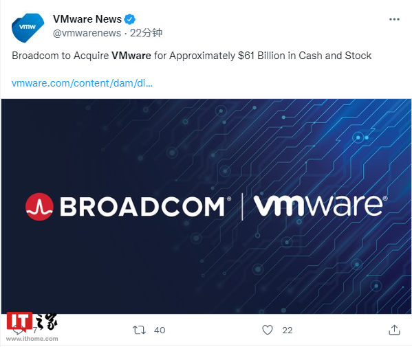 两家公司周四宣布,根据博通普通股 2022 年 5 月 25 日的收盘价,博通将以 610 亿美元(约 4080.9 亿元人民币)的现金和股票交易方式收购 VMware。