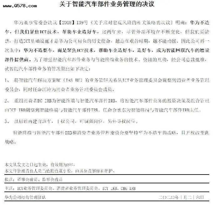 决议中强调,智能终端与智能汽车部件IRB和消费者业务管理委员会要坚持华为不造车的战略,且无权改变此战略。