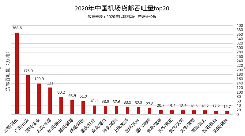 《2020年民航机场生产统计公报》显示,全国一半货邮吞吐量集中在上海、广州、深圳、北京四大城市机场。而从国际货运来看,北京、上海、广州、深圳和郑州五个大机场,又集中了全国货运量的近90%。