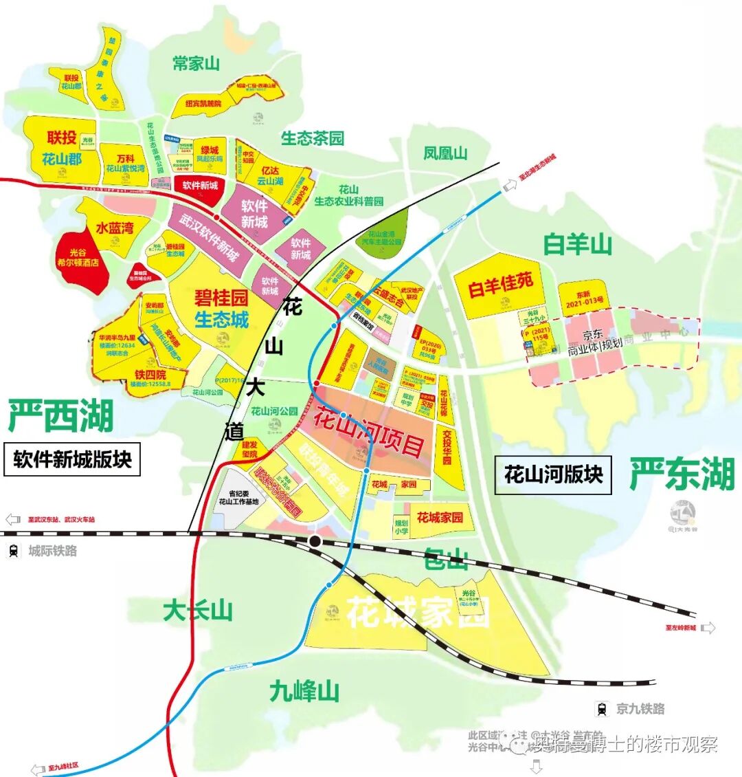 看上图,以花城大道为界,我个人将花山分为西边靠严西湖的软件新城版块和东边靠严东湖的花山河版块。