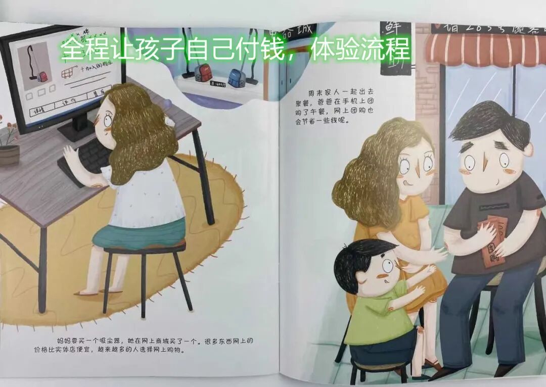 比如,讲到《我会用钱买东西》这本书时,我就会带娃,把孩子储蓄罐里的钱,全都拿出来。然后,让孩子自己查下钱数。查完了后,做出估算,现在需要出去买什么东西,可能会花多少钱?最后,我们真的会付出行动,一起去购物,全程让孩子自己付钱,体验流程。