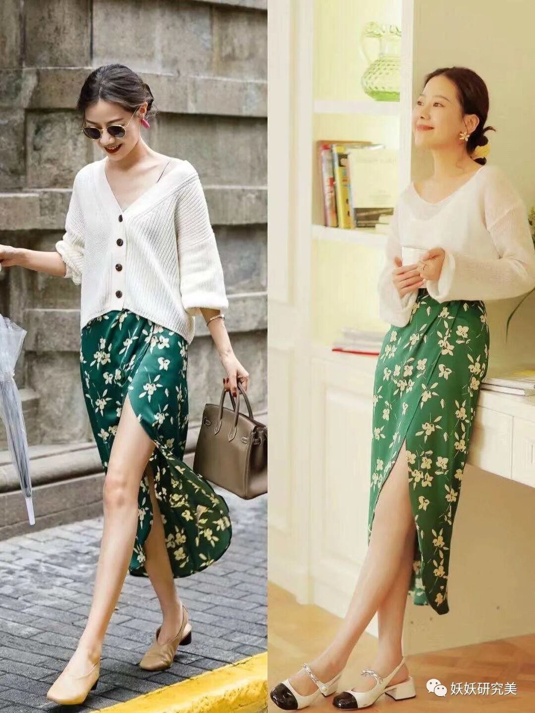 迷笛碎花裙和浅色玛丽珍鞋搭配在一起就非常有夏日的感觉,加入开叉设计的裙摆会让女人更有韵味儿哦。