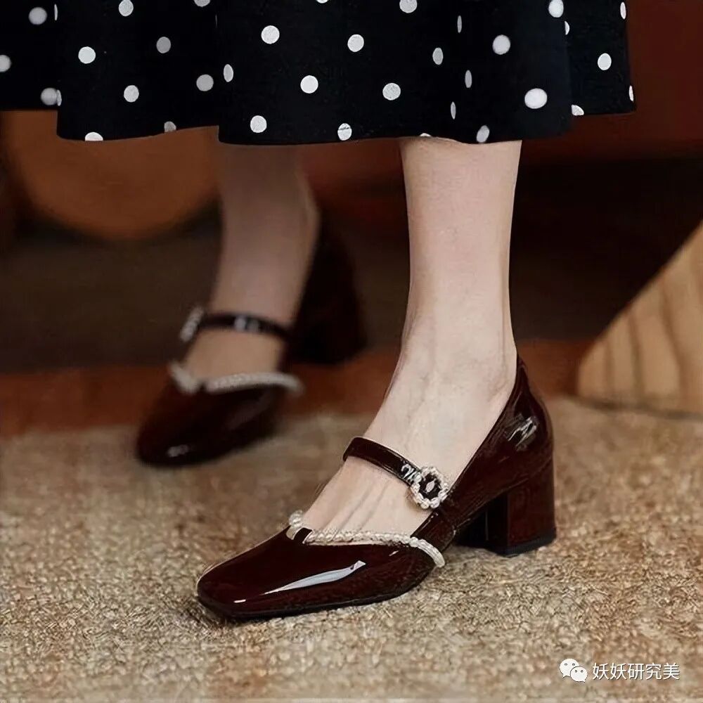 玛丽珍鞋的气质更加好摸索,如果有珍珠作为点缀,宫廷的贵气感会更强,而玛丽珍鞋在搭配上也很简单,用同样复古的元素来组合就不会出错,比如波点、碎花等。