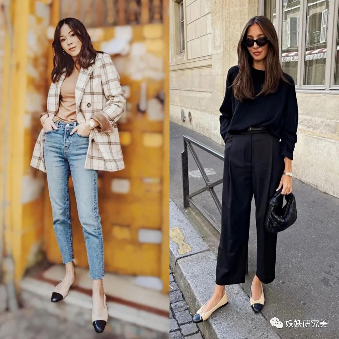 相较于前两款鞋子,芭蕾鞋在视觉上会显得更加修长,有拉伸脚长的作用,能够有效帮助女人们显瘦显高,作为平底鞋气势不输高跟鞋,在搭配上想要偷懒的女人可以多尝试。
