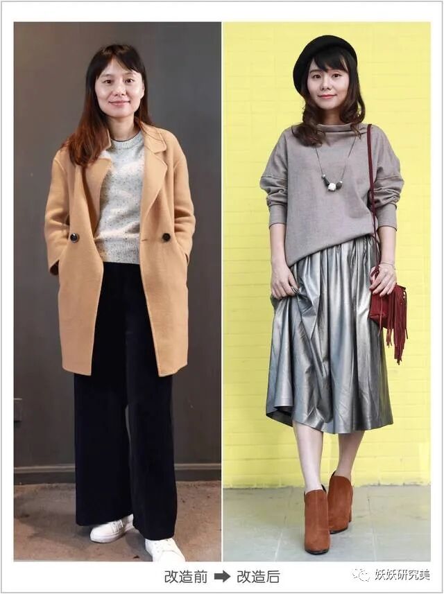 如下图,其实这位妈妈原来穿的衣服并不丑,除了内搭都挺好看的,整体看上去很普通,是因为单调。改造后依旧穿的这种宽松无腰身的服饰,同样单调,但一条长的项链使腰线调高,也收缩了上身宽度,才使人看着高了不少。