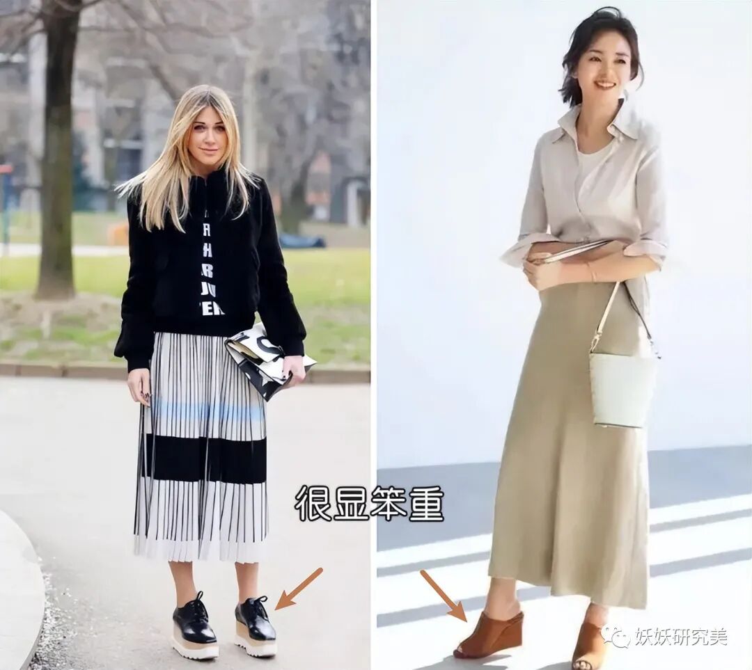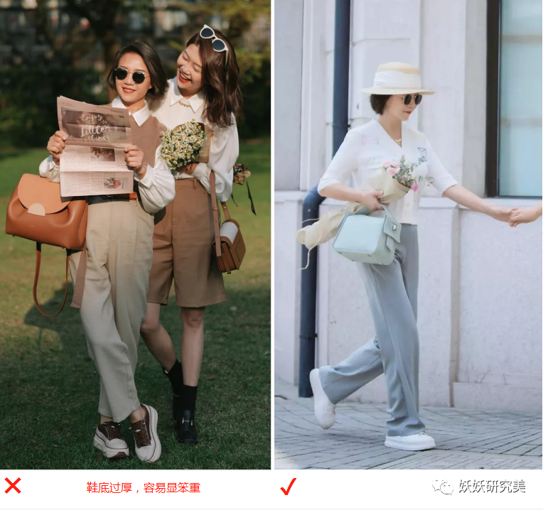 鞋底过厚,容易显笨重感,但如果是小个子选择厚底鞋,一定要注意尽量不要选择过厚的,像右边这双中厚底的会比较好,既显高看上去也更轻盈。另外要注意,颜色上尽量避开深色的,夏季穿会更清爽。