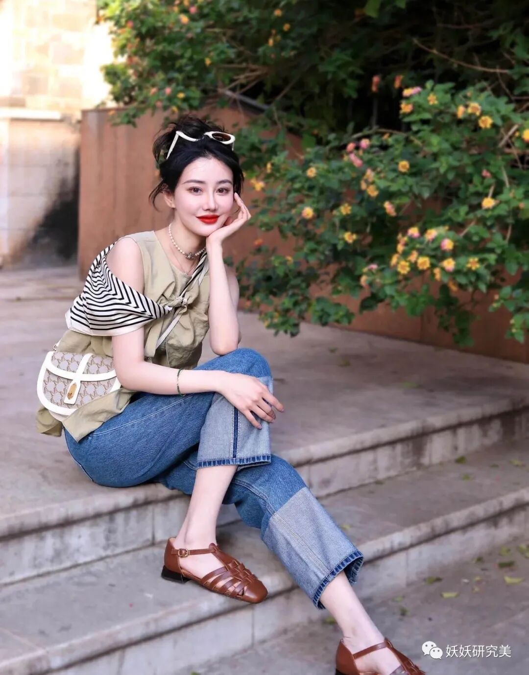 罗马凉鞋的搭配度很高,无论是日常休闲的穿搭还是风格比较强的穿搭都能搭配出来。像这一身法式穿搭,牛仔裤与罗马凉鞋就能营造出一种随意感。