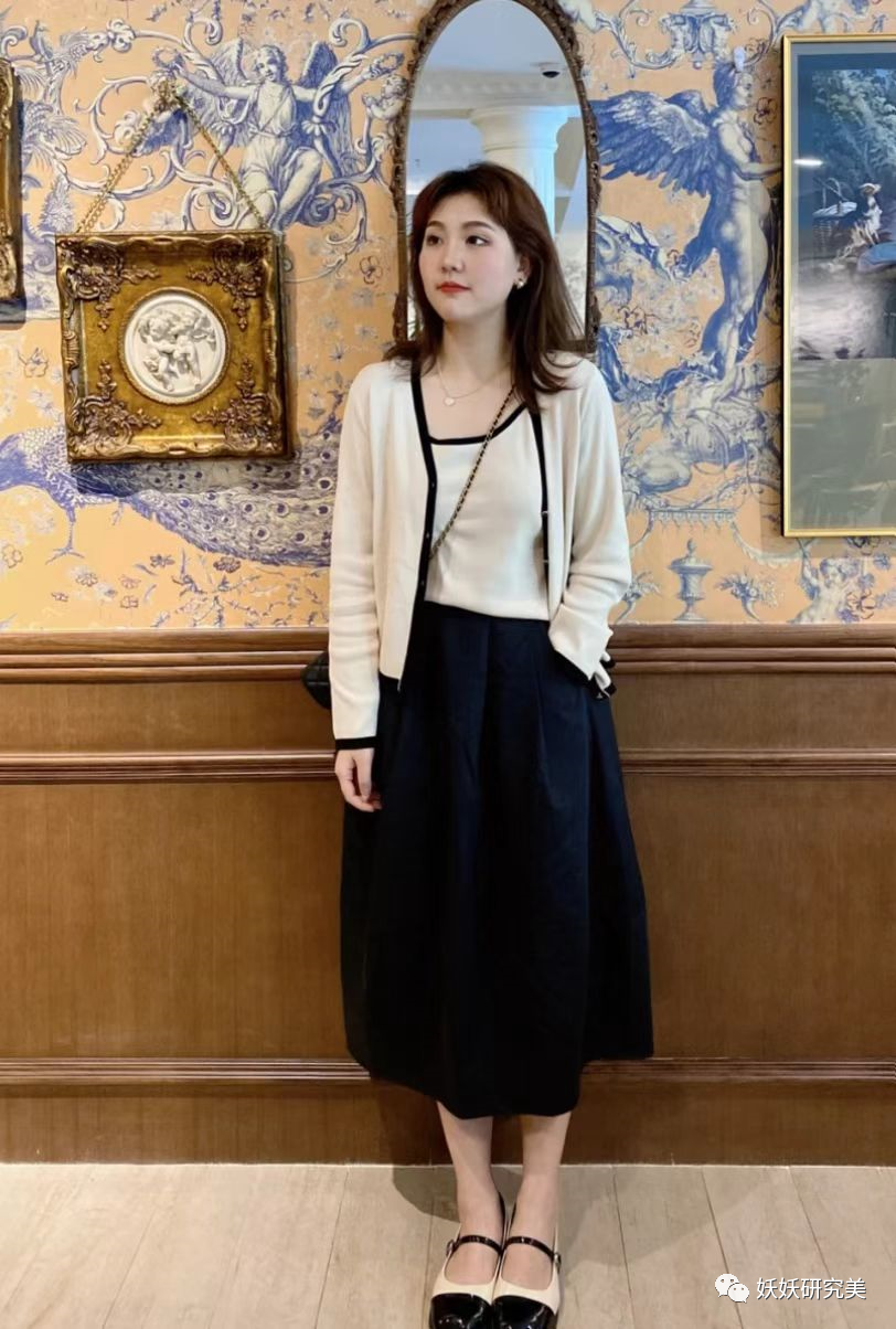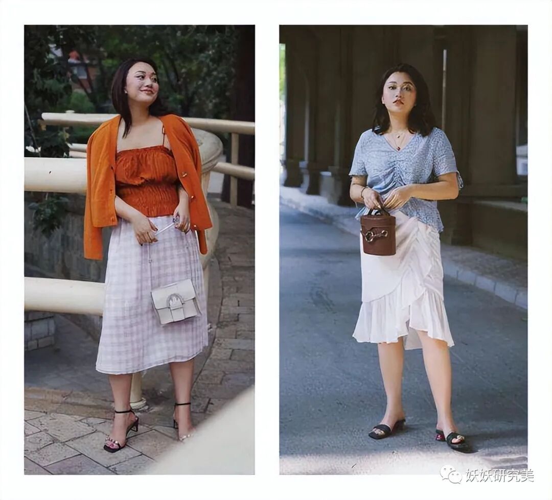 有些人小腿粗,穿裤子全部遮住或许还能显腿长,但穿裙子若是遮住脚踝,看着如同不倒翁。膝下裙最佳的长度应该是在小腿肌肉与脚踝分割线上,这样腿最粗的地方遮住了,最细的地方也全部展示出来了,和纤细的腰部一呼应,根本让人看不出你胖在哪儿。