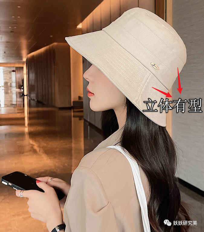 尼龙材质的帽子摸起来滑滑的,触感比较舒服,而且版型比较硬朗,能够修饰头部轮廓。这种材质防晒力较好,但是易产生静电,且不适合在阳光下暴晒。▼