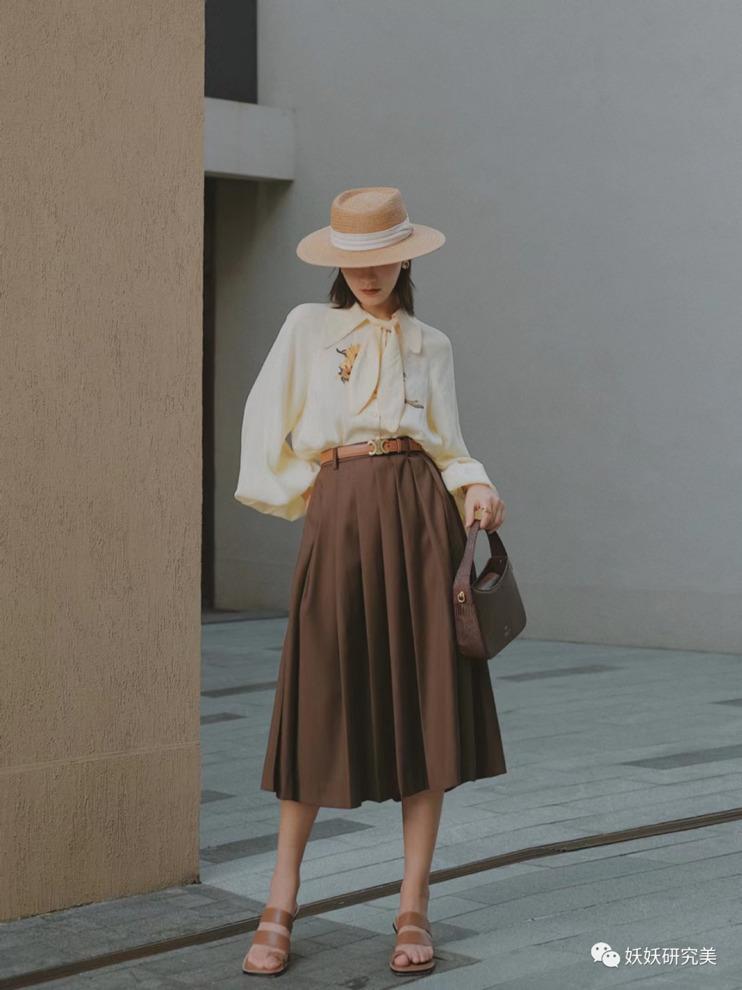平顶礼帽最早起源于14世纪的英格兰,原是贵族身份的象征,如今成为了时尚达人备受喜爱的单品,在日常生活中也被广泛采用。这种帽子搭配深色系的半身裙显得既复古又干练,再搭配蝴蝶领设计的衬衫又为造型上增添几丝俏皮,使整体看起来不至于太过庄重,这样的搭配非常适合日常上班。▼