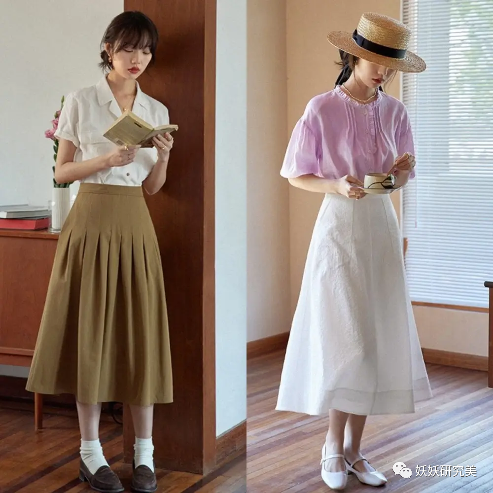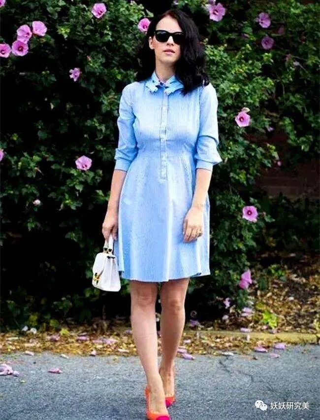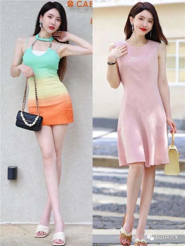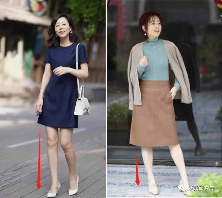 且需要注意的是,无论连衣裙或半身裙,都不要选择刚好盖住膝盖的款式。一般下装都是高腰设计,腰线抬高腿会被拉长,若是裙长在膝盖处,明显分节,上半段看着会很不协调,同时也会显得小腿弯曲。