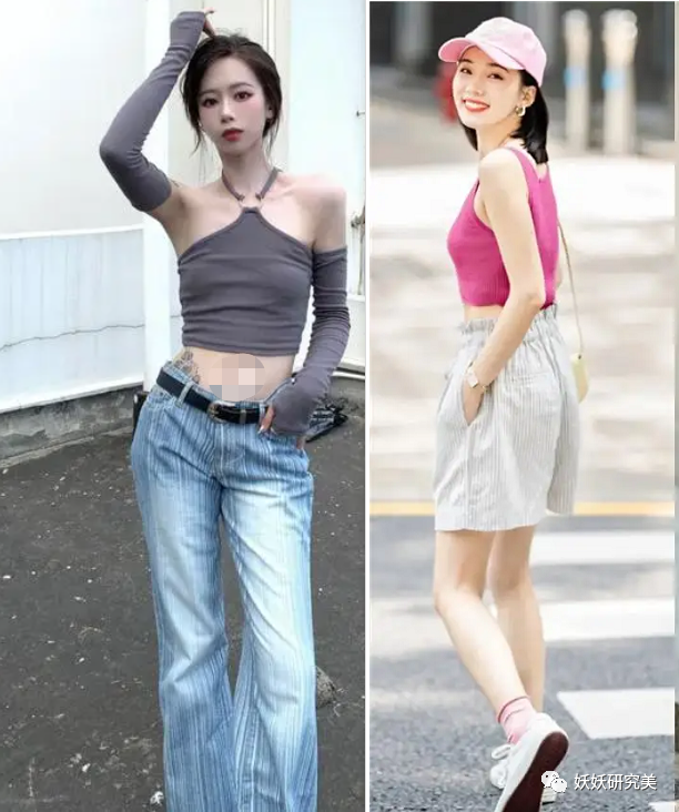 适当露肤清新,过度露肤夸张。网上常呼吁上露下不露,下露上不露,其实并没有那么绝对。以下图为例,同样是小背心上衣,右边腰胳膊腿都露了,视觉效果上却不如长袖长裤的左图露得夸张,反而更日常清新。