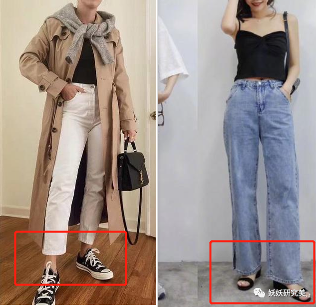 长裤建议最短在脚踝上方5-10cm左右,刚好露出小腿处最纤细的地方,显瘦且轻盈。要么裤脚再长一些,覆盖在脚背上,直接把腿部线条拉到最长,哪怕身高150cm,也能穿出170的效果。