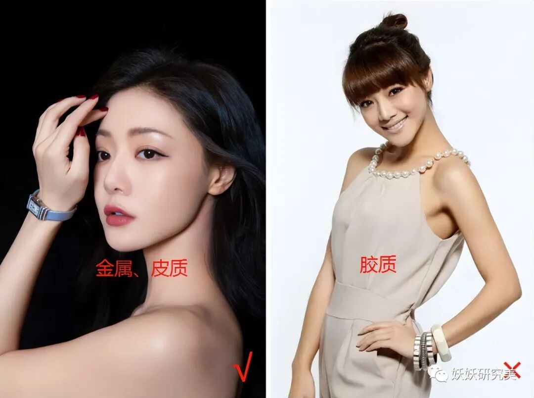 金属表盘、皮质表带,小小一只手表,虽然存在感不强,与充满女人味的抹胸裙相配,尽显优雅轻奢,不经意间体现出佩戴者的个人衣品与独特气质。而胶质的组合手镯却与在正式场合中会穿着的西装连衣裙格格不入。材质不在于价格昂贵,而在于与服饰匹配。▲
