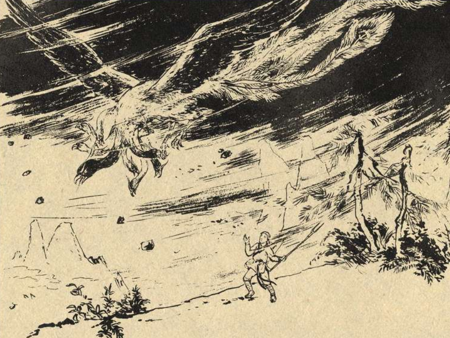 弟弟看了半天,只捡了一小块金子,骑在凤凰背上,又飞回到了家中。