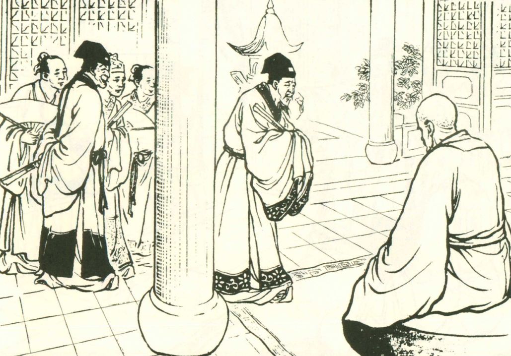 阎王目光炯炯有神,容貌高耸,穿戴官服官帽,姿态庄严,在看完案卷之后,念他还有羞耻之心,决定从轻发落,判他转世去做乞丐。