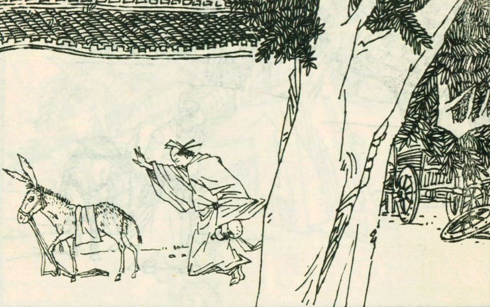到了比赛那天,财主骑上狐狸变成的驴,为了赢取比赛,用力挥动驴鞭,驱使“千里驴”加速。