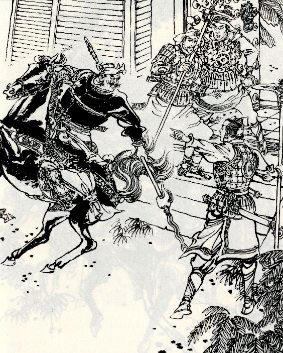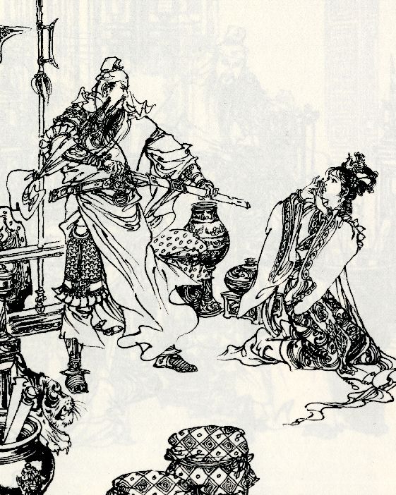 想到这里,关羽又冲进洞房,用衣服袖遮住眼睛,一剑刺向貂蝉……