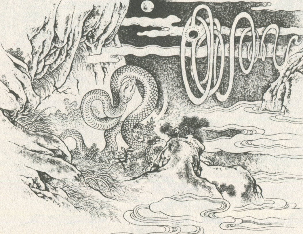 明月当空,小青嘴中念念有词,不一会儿,现出原形,从嘴巴里飞出一颗隐隐发光的青色小珠。