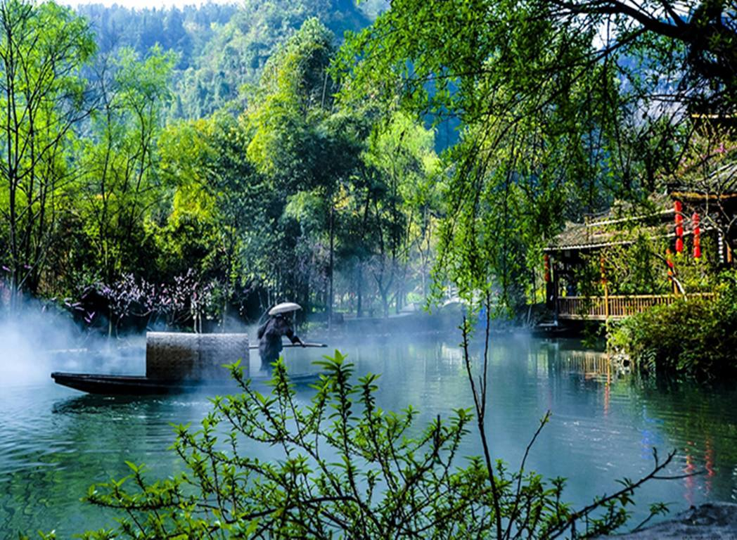 这里山明水秀、树绿竹翠,虽然一路上没有看到农田,也没有看见行人,但处处都有各种造型古怪的建筑物,显然有人曾在这里居住。