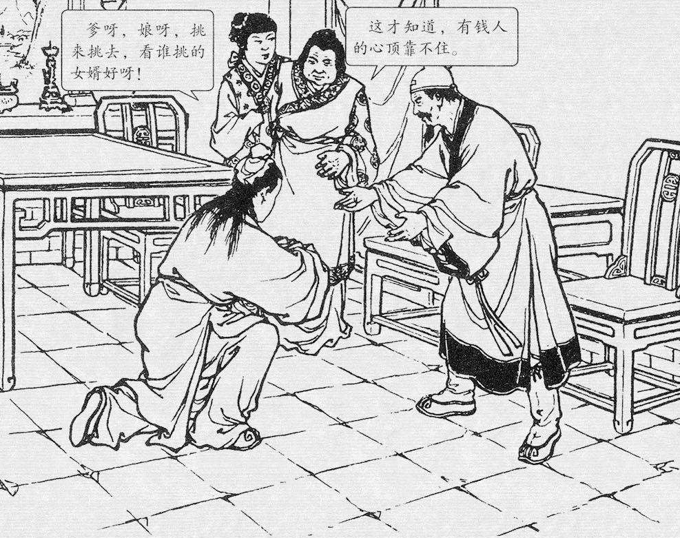 翠莲说什么也不愿意嫁给刘家公子。这可把赵员外急出了一身热汗,苦口婆心说道“刘家少爷虽然长得一般,但却是家中独子,他家金银数不胜数,粮食堆满仓,你若是嫁过去,享不完的荣华富贵啊!”