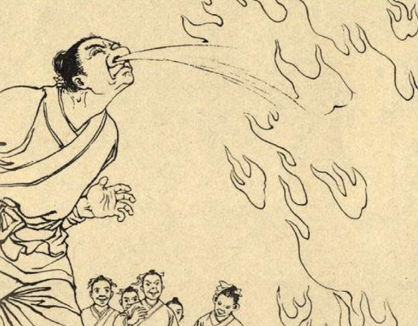 国师懂得法术,祭出一团火球,想烧死七兄弟。可不想老四不怕火,嘴巴一张,把火球吞进了肚子,从鼻子里冒出一股青烟,打了个响嗝。