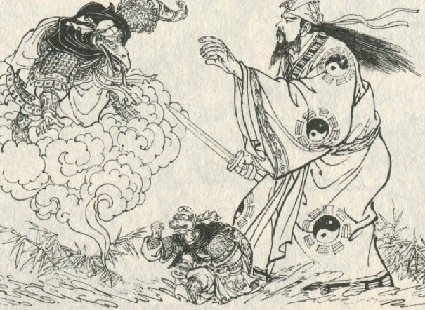 祖师爷大吃一惊,连忙掐诀念咒,招来龟蛇两将军。谁知一个瘸着腿,一个破了相,愁眉苦脸向他哭诉。