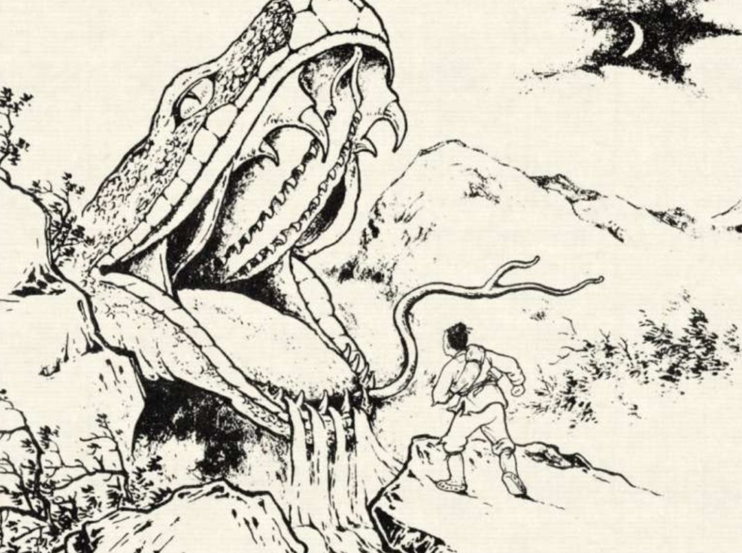 蟒蛇精左等右等,一转眼过去了半个多钟头,也没见小木匠回来。饿得四肢无力,心里发慌,这才明白自己被骗了,气得火冒三丈,又心有不甘,追随着小木匠的气味找了过去。