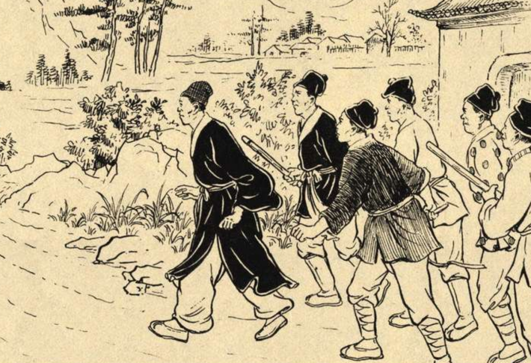 一群人手拿棍棒,跟随着痕迹大声吆喝一路追赶。
