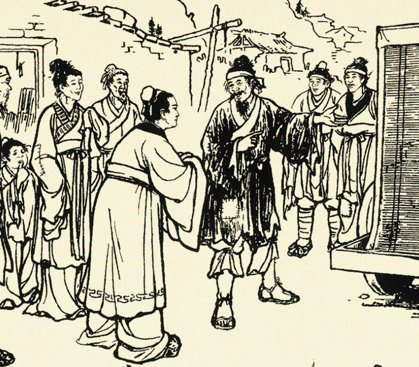 没过几天,傻丈夫出门遇见老丈人,老丈人心疼女儿,准备过去看看。就说:“姑爷,听说你们家日子不好过,我跟着你过去看看吧!”