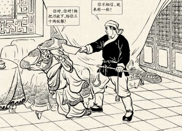 刘大脑袋转身就拿进来一把菜刀,说:“我说九斤半,你非说是九斤九两,那只有把脑割下来,称一称就能知道。”