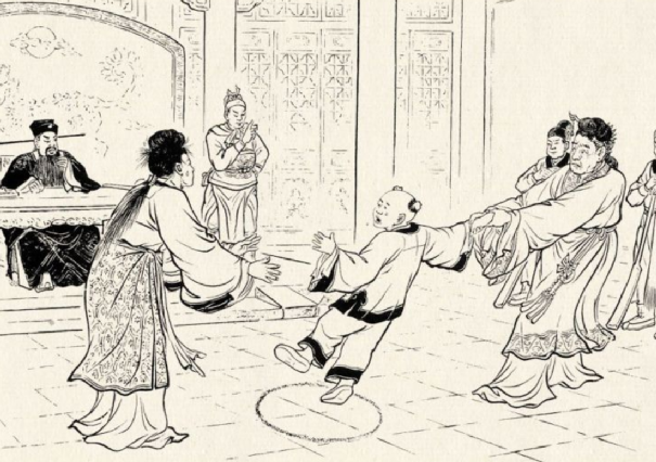 “这个案子断了三年,没人断得清楚。今天,我一定能弄明白。现在,你们各拉住孩子的一只胳膊,我喊一声拉你们就使劲拉,谁把孩子拉过去,孩子就是谁的。再不许纠缠不休!”