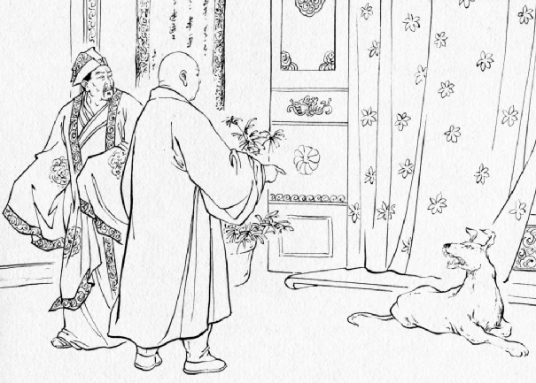 刘小山出门一看,大门外边站着一老一小两个和尚,狗正扯着老和尚的衣服不松口。