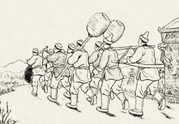 就这样,王小二和桃花仙子风风光光办完了婚礼,大家感谢他们赶走了蛇妖,都纷纷前来喝彩,同时有样学样,效仿桃花仙子成亲,每当有男女结婚,就会让新娘子顶上盖头布,进门撒香料,堂屋放铜镜,趋吉避凶,图个“吉利”。