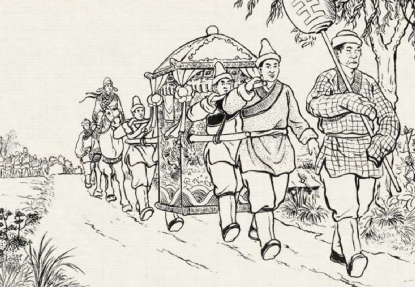 此时,桃花仙子已经下了轿,在妇人们的搀扶下,正迈着碎步准备进家门。