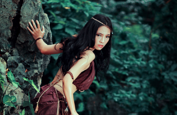 正如本故事中的“女野人”牛氏一样,屈原描写的“女野人”似人非人,站在山梁子上,浑身披挂着薜荔藤,带系松萝蔓,多疑善笑,含羞带臊。