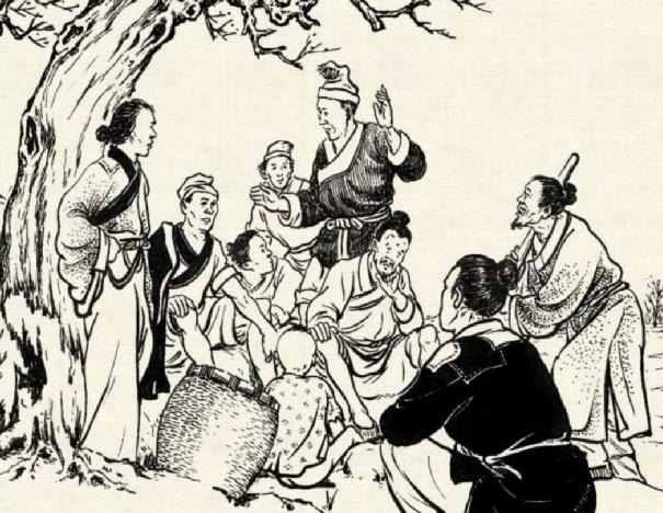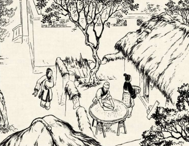 张三站在屋顶上远远看见老丈人过来,连忙让媳妇把碓窝挪到墙边。