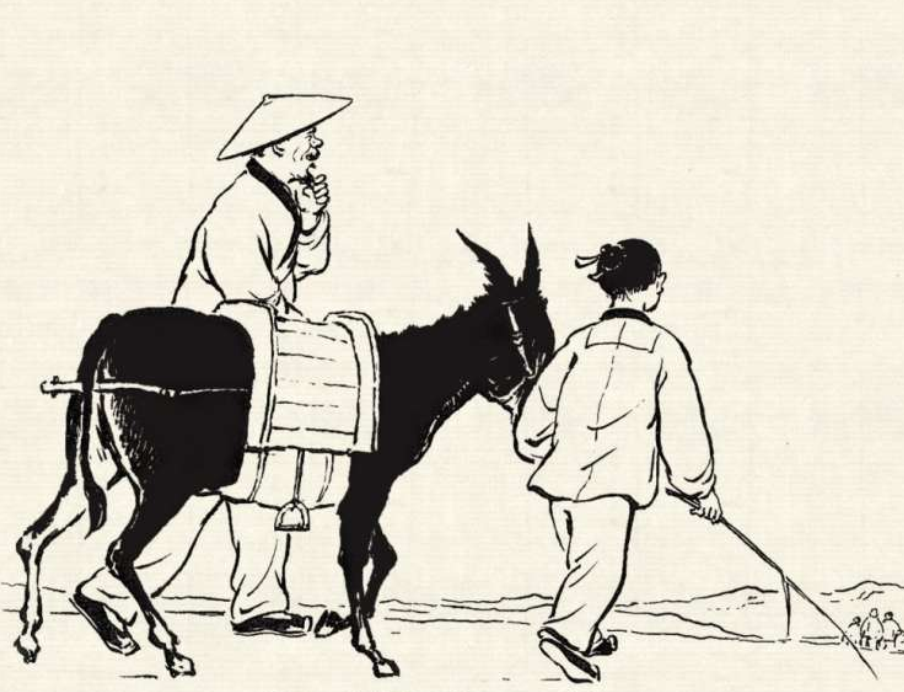 路上,黄蛤蟆偷懒,就把牵驴的绳子系在自己的裤腰带上,自己只顾着埋头向前走。