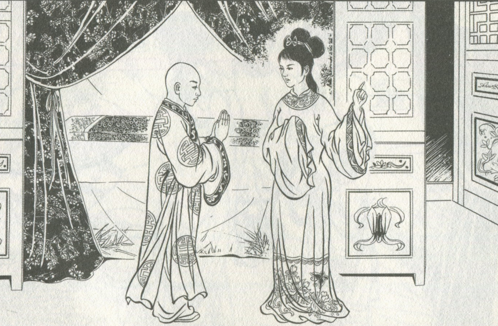 德云和尚房间进屋关上门,独自坐在屋子里诵经。子时之前,周围寂然无声,平静如常。然而子时刚过,房间里慢慢地显出了如月模糊的身影。满脸渴望的神情,越过德云和尚,左右环视。