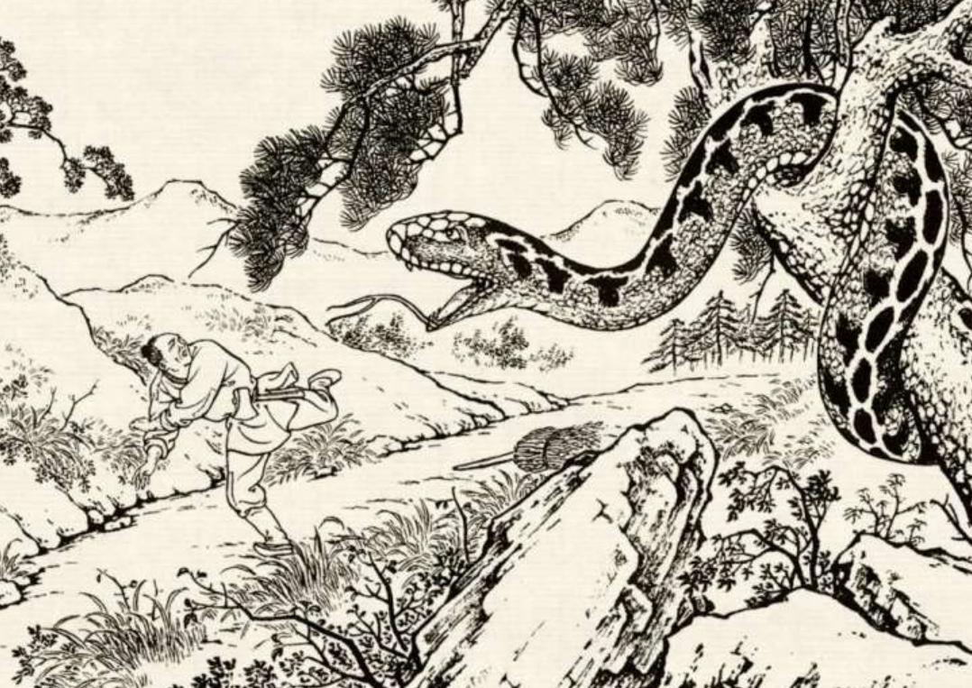 谁知走到半路,蛇郎突然摇身一变,现出原形,变成一条数十丈长的巨蟒。
