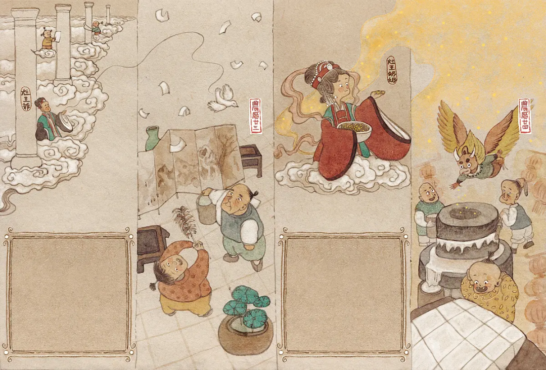 夫妻二人听封完毕,叩头谢恩,姜子牙将封神榜贴在了锅台后墙上。拂尘一扬,夫妻二人连同鸡狗飘入了画图之中,成了灶王神像。