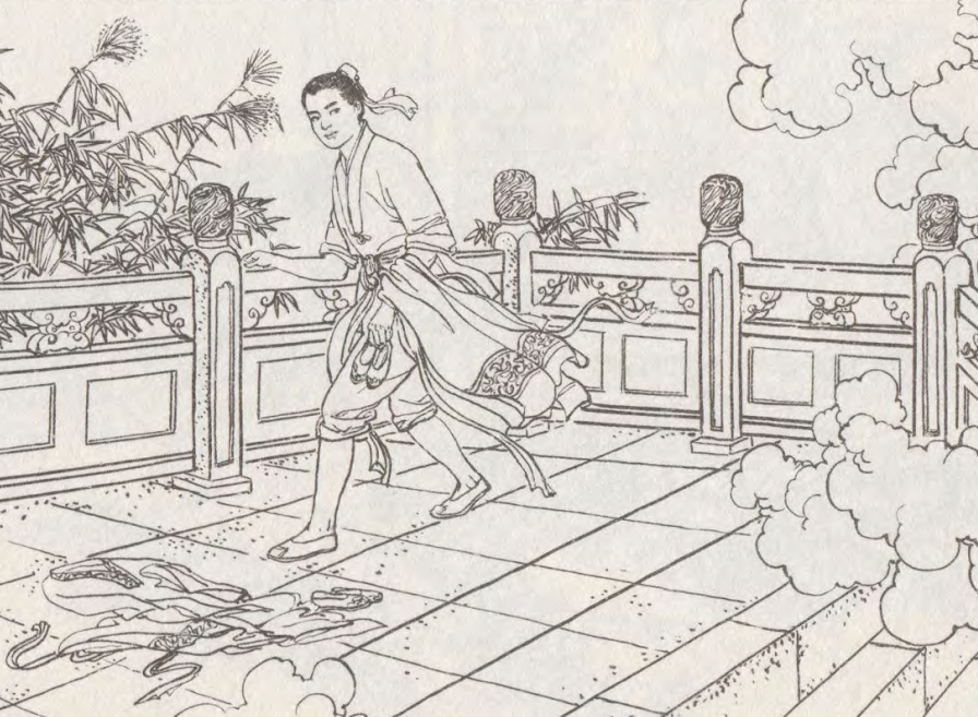 这时候,一个嬉皮笑脸,相貌猥琐的公子哥涎着口水,来到池边对七仙女说:“我是这里的蛤蟆精,已经修炼了千年,只要你答应做我的老婆,我就给你衣服!不然……”