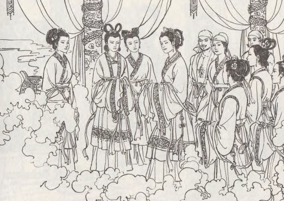这可把其他几个仙女吓坏了,赶忙飞回天宫,口口声声说要帮她找件衣服。可没想到上了天宫,王母娘娘正为其他事情发火,几个仙女都怕触霉头,不敢提及洗澡丢衣服的事情。