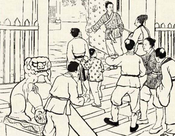 两人来到襄阳府衙。只见衙门口一边蹲着一对大石狮子,张牙舞爪,十分吓人。石狮子后面是白花花的一溜台阶,齐刷刷站着两排衙役,威风凛凛,十分威武。